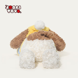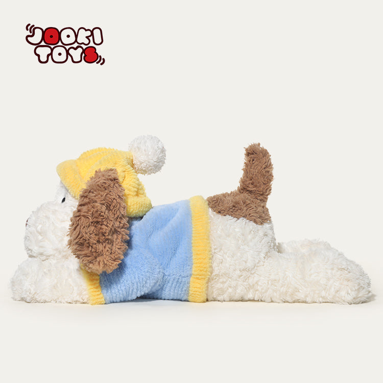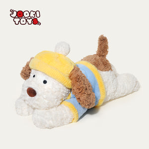 دمية كلب نائم على بطنه محشوة ناعمة مع قبعة شتوية