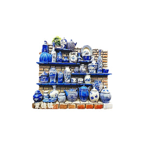 مغناطيس ثلاجة بتصميم مجسم على شكل رف مليء بقطع الخزف الصيني التقليدي باللون الأزرق والأبيض. يحتوي على تفاصيل دقيقة جداً تشمل أباريق، مزهريات، صحون وأكواب مرتبة على رفوف مع خلفية جدار طابوق، مما يعطي إحساس قطعة فنية مصغرة مو مجرد مغناطيس عادي.