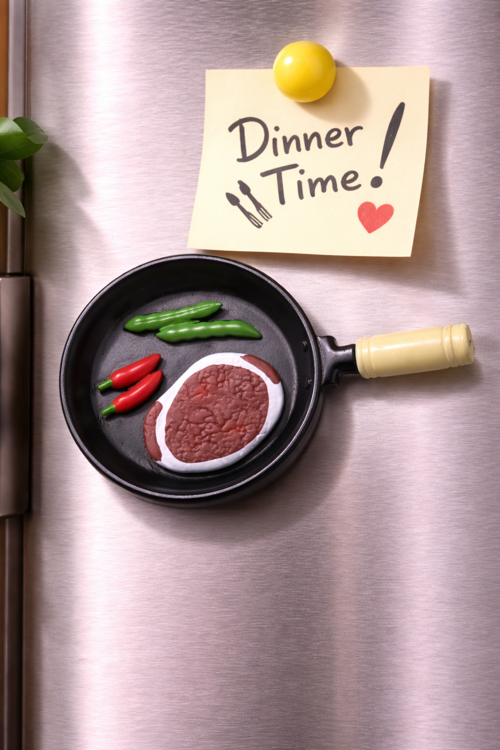 مغناطيس ثلاجة بتصميم مميز على شكل مقلاة تحتوي على قطعة ستيك مع فلفل حار (أخضر وأحمر)، ما يعطي طابع “عشاء” واضح ومختلف عن تصاميم الفطور. يتميز بتفاصيل الطعام داخل المقلاة وليس شكل المقلاة فقط، مما يجعله فريد بين باقي مغناطيسات المقالي. مناسب لتثبيت الملاحظات ويضيف لمسة مطبخ حيوية ومليئة بالتفاصيل