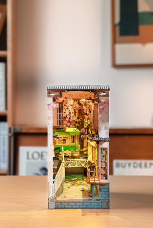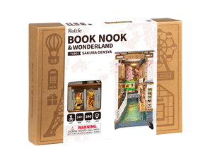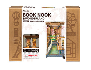 زاوية الكتب Sakura Densya من سلسلة Rolife Book Nook & Wonderland تأخذك في رحلة بصرية إلى شوارع يابانية تقليدية مزينة بأزهار الساكورا المتساقطة وقناة مائية هادئة.
