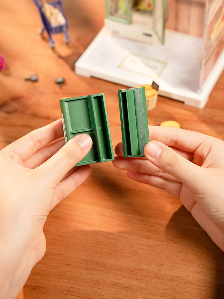 تصميم صغير الحجم لكنه غني بالتفاصيل، يشمل ثلاجة فواكه، رفوف مرتّبة، عربة تسوّق،