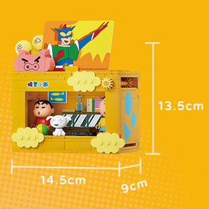 مجموعة مكعبات تركيب مستوحاة من عالم Crayon Shinchan بتصميم غرفة صفراء مشرقة مليئة بالتفاصيل الكرتونية اللطيفة.