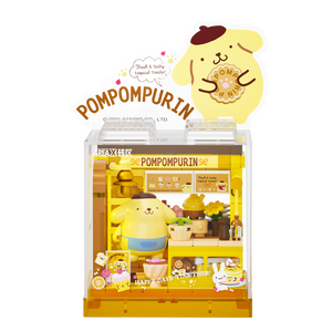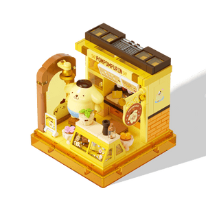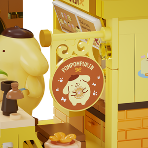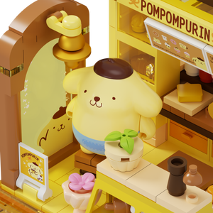A cute Pompompurin dessert shop building blocks set inspired by Sanrio characters.