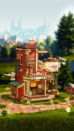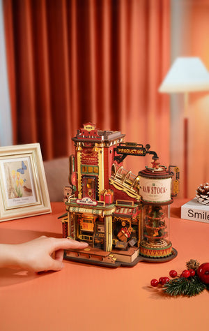 مجسم خشبي تفاعلي مستوحى من عالم الخيال والمصانع السحرية، حيث تتحرك خطوط الإنتاج وتضيء التفاصيل مع موسيقى هادئة تمنح التجربة طابعًا فنيًا فريدًا.