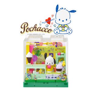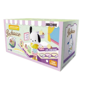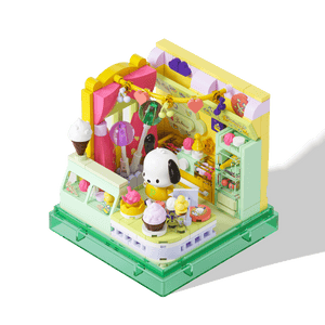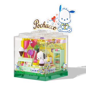 A cute building blocks set inspired by the beloved Sanrio character Pochacco, featuring an ice cream shop design inside a clear display box. Offers a fun building experience with adorable details, perfect for collectors, gifts, and fans of cute-themed block sets.
