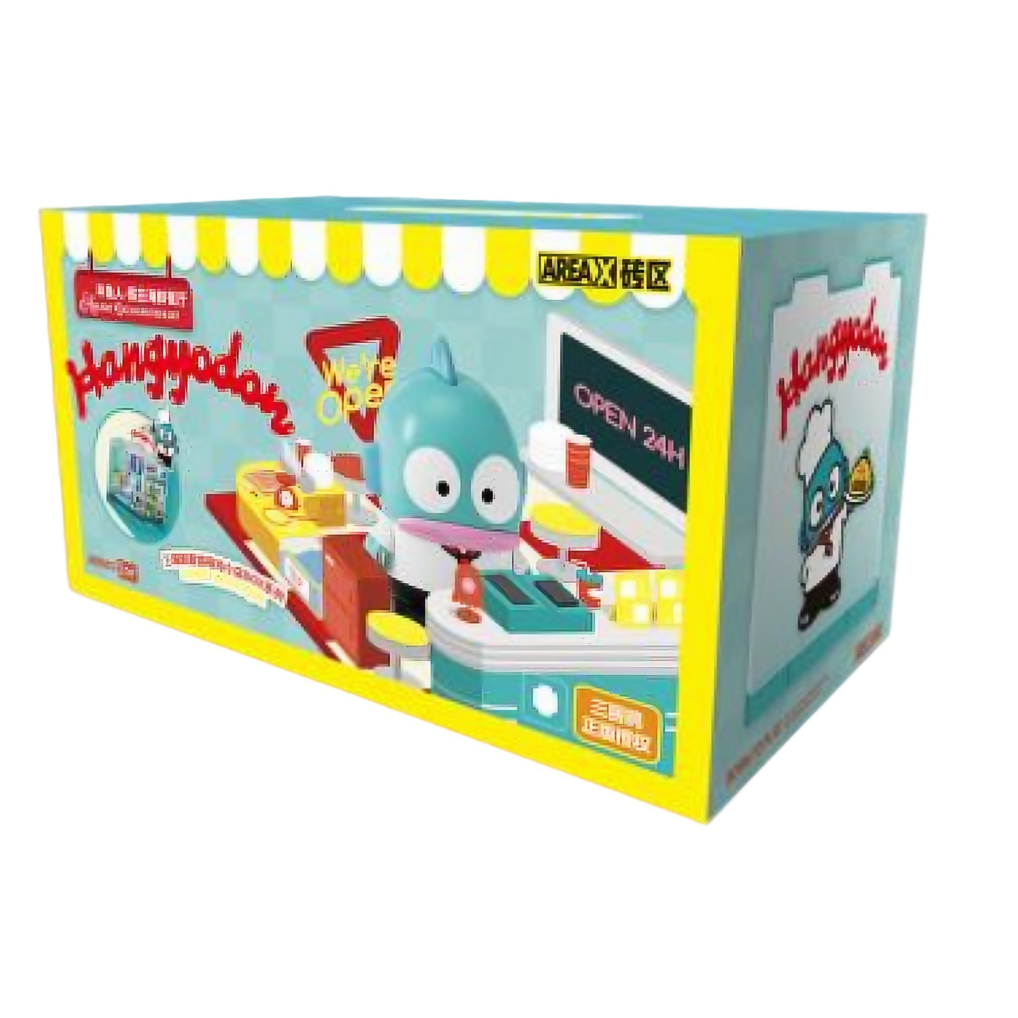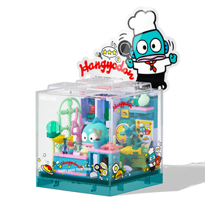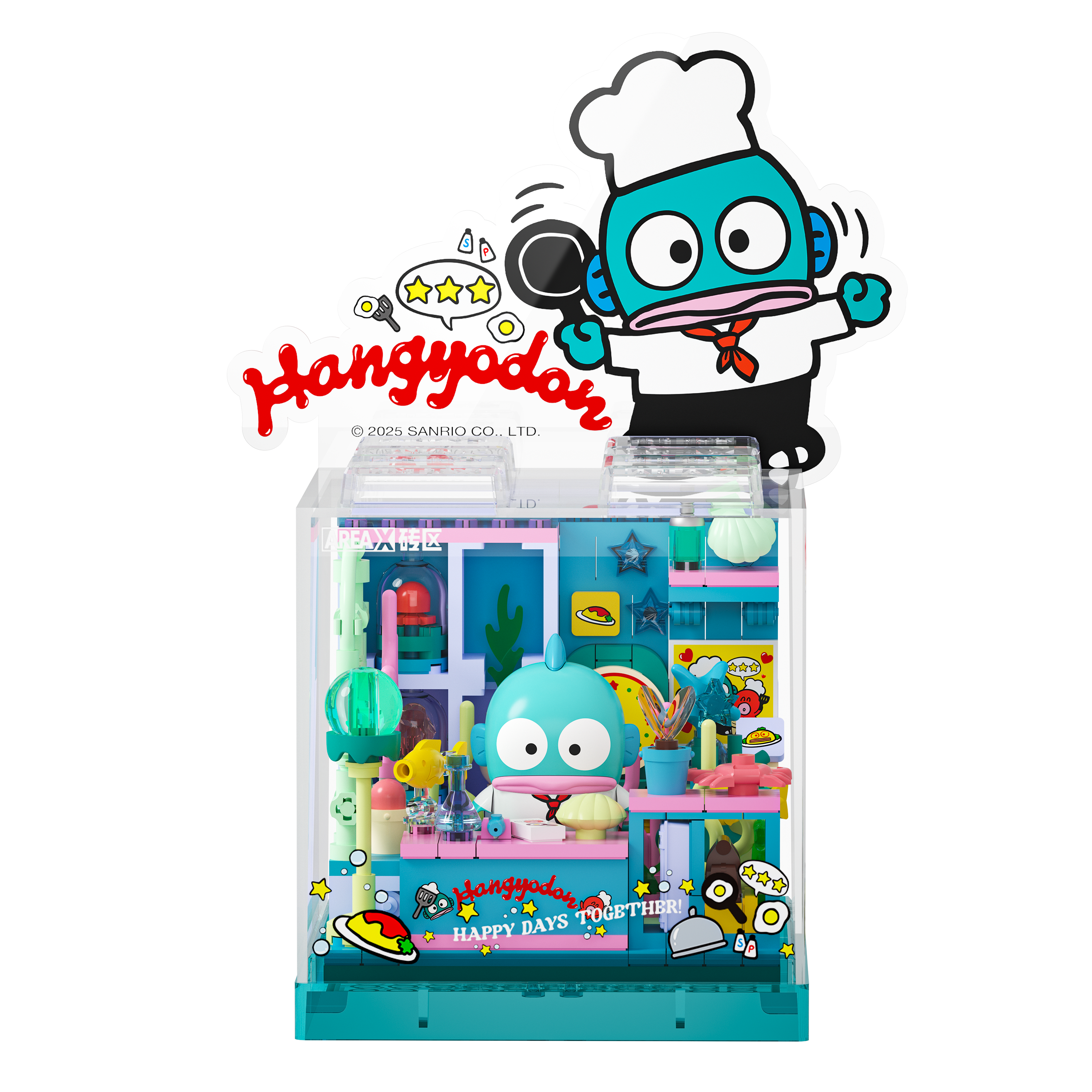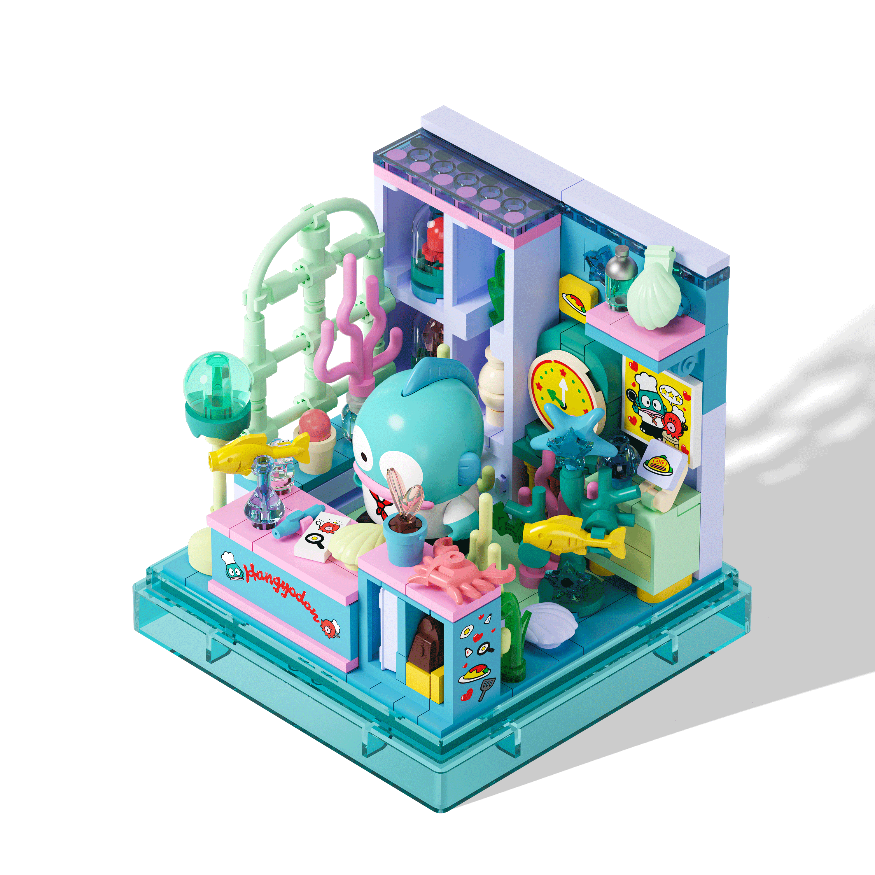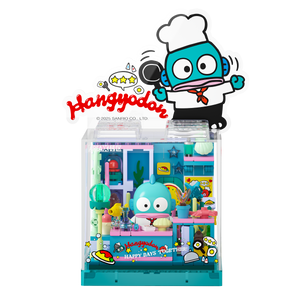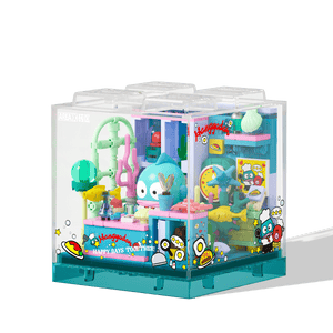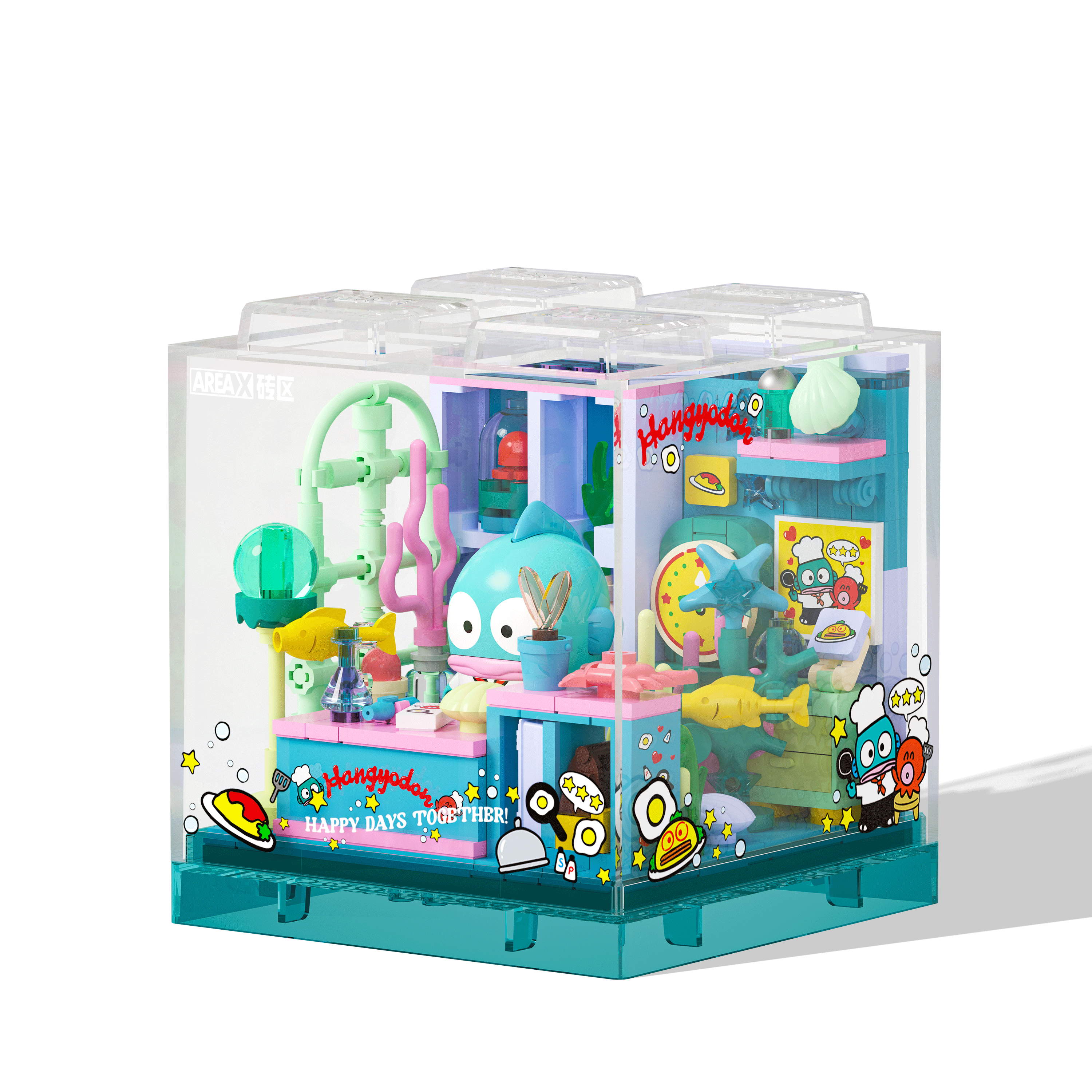 مجموعة مكعبات بناء مصغّرة بتصميم شخصية Hangyodon من Sanrio، تأتي داخل صندوق عرض شفاف أنيق يضيف لمسة جمالية بعد الانتهاء من التركيب.